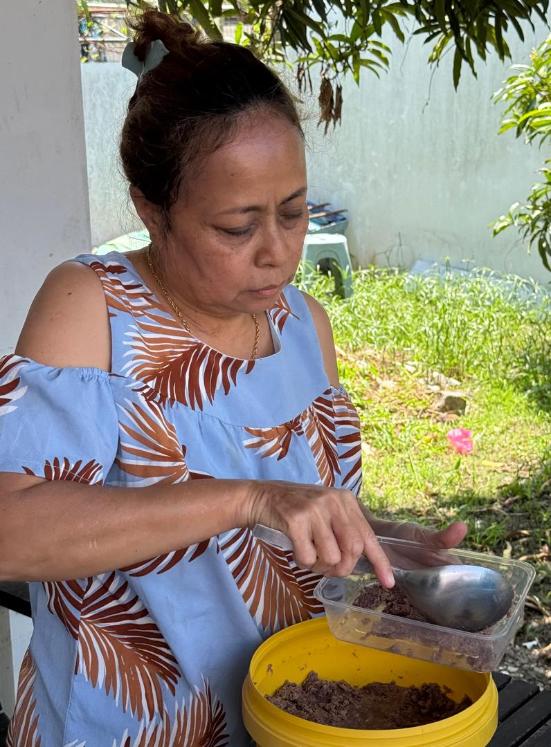 Juliana showing how the belacan and dried bubuk is packed and ready for sale.